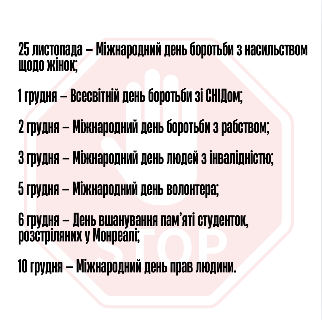 • 25 листопада — Міжнародний день боротьби з насильством щодо жінок;